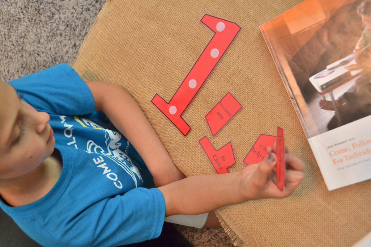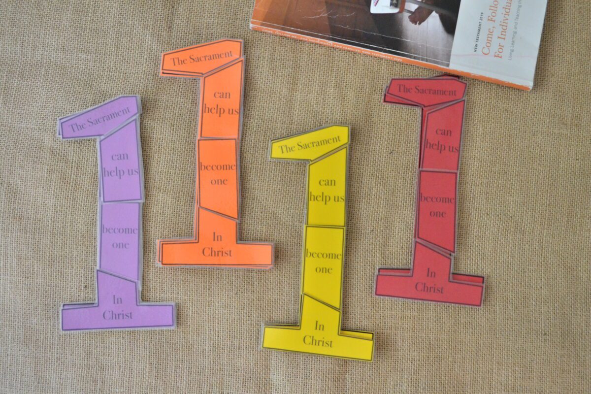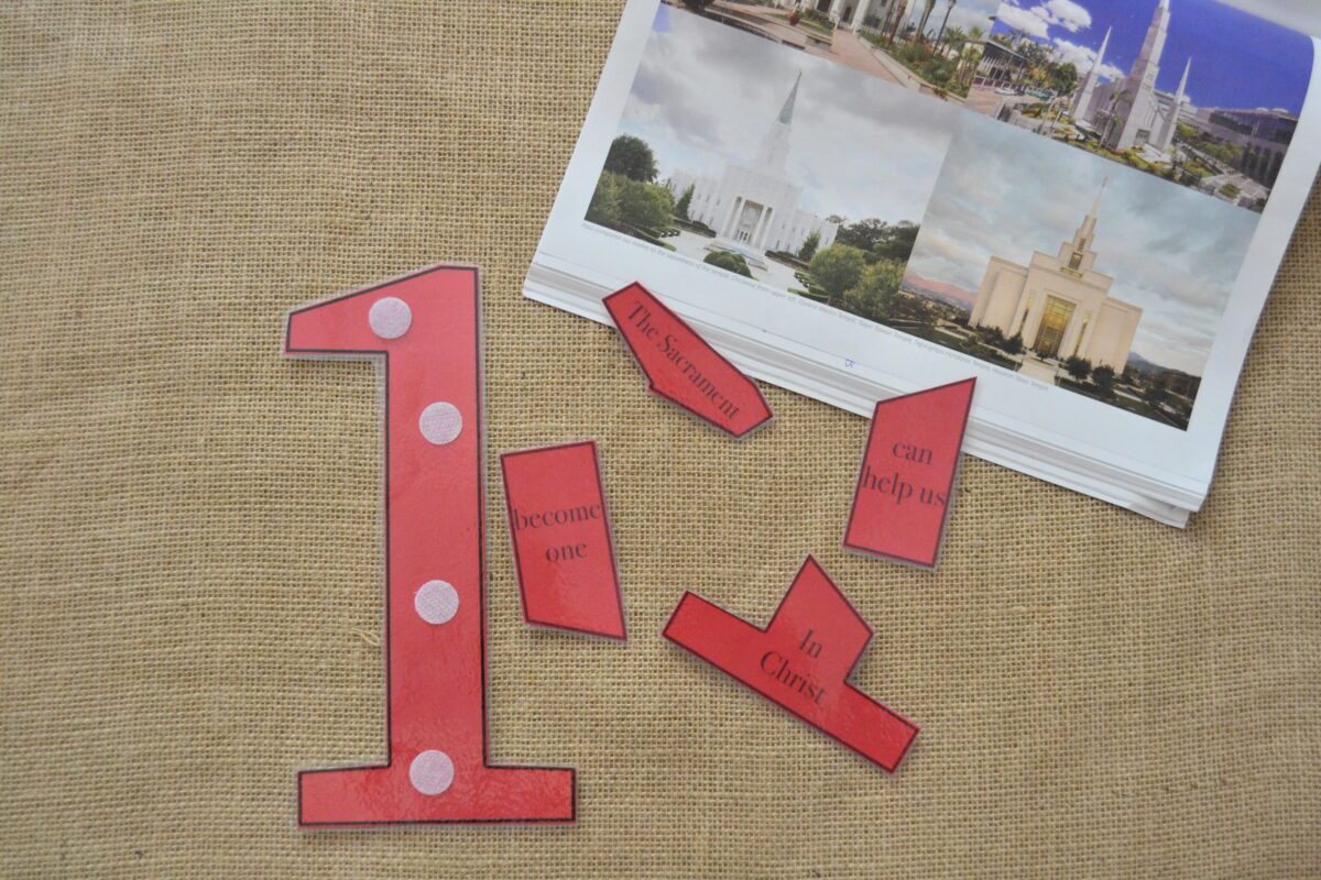 I suggest printing the number one puzzles on colored card stock and laminating them then using velcro dots. The sacrament trays are also meant to be interactive, children can put the cups and bread on and off the trays. In order for them to do this you need to laminate them and then use velcro dots again. You may color them before laminating if you’d like. These are excellent for sacrament meeting!