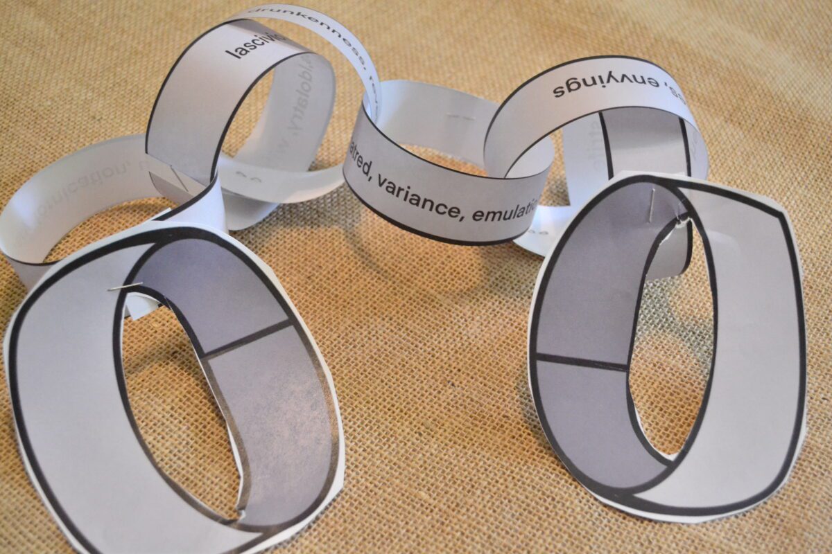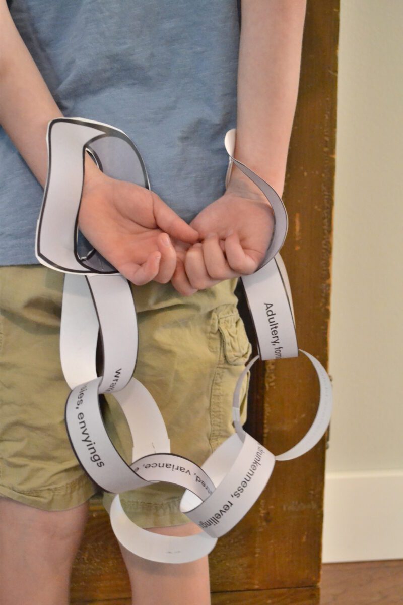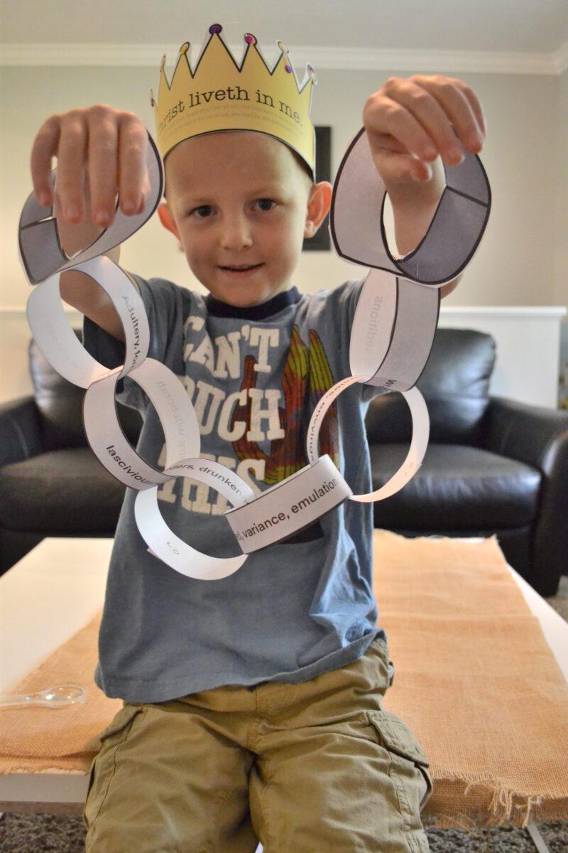 The main lesson this week includes a scene of Galatians with figurines of Paul, Titus, and Barnibus to color (we attached our background scene to a file folder to help it stand). “Chains of bondage” made out of a paper chain to teach about the freedom the gospel brings. A cute crown that says “Christ liveth in me.” You can decorate these crowns with any craft supplies you have on hand (glitter, sequins, beads, stickers, etc). Fruit in a basket to discuss the fruits of the spirit.