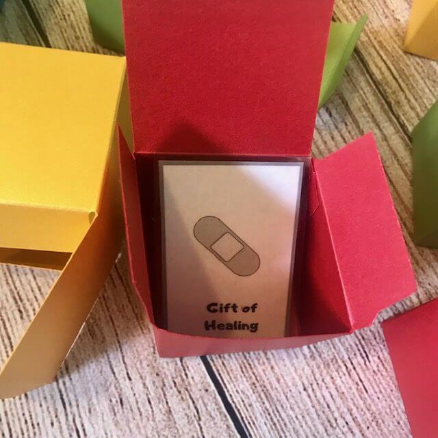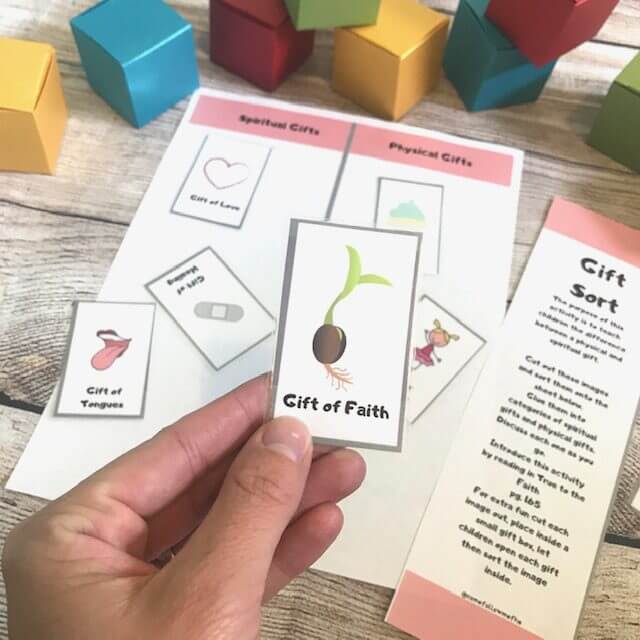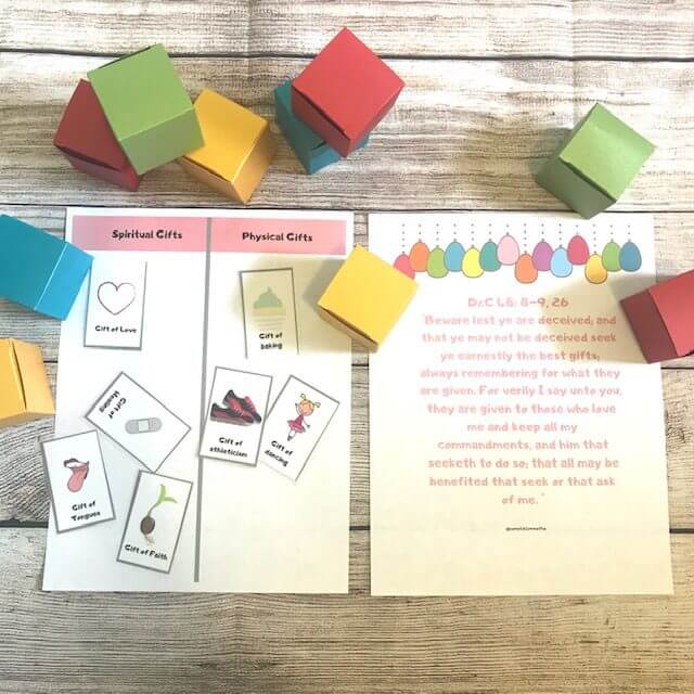 We enjoyed learning about each others talents! We discussed the difference between physical and spiritual gifts and talents. We opened gifts from these cute colorful boxes which my kids LOVED! We sorted the images and read about the parable of the talents from the bible.